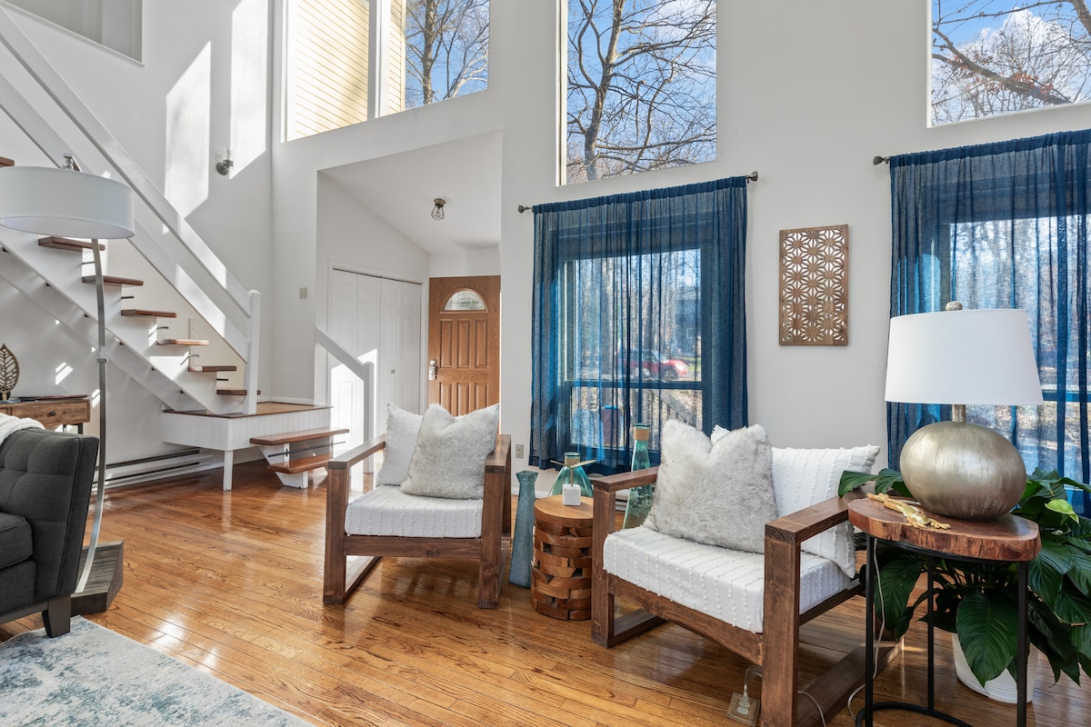 Beautiful luxe townhouse for up to 8 guests, with 2 bedrooms, 2.5 baths, a full kitchen, office, loft, and a deck with a grill overlooking parklike shared grounds. Bright interiors, skylights, mountain views, and a marble master shower will take your breath away. Steps from Shawnee Mountain and a short drive to Shawnee Inn & Golf, Bushkill Falls, the Delaware Water Gap, outlets, and dining. Includes breakfast, snacks, and quality body care—ideal for families, couples, or groups. Decor available.