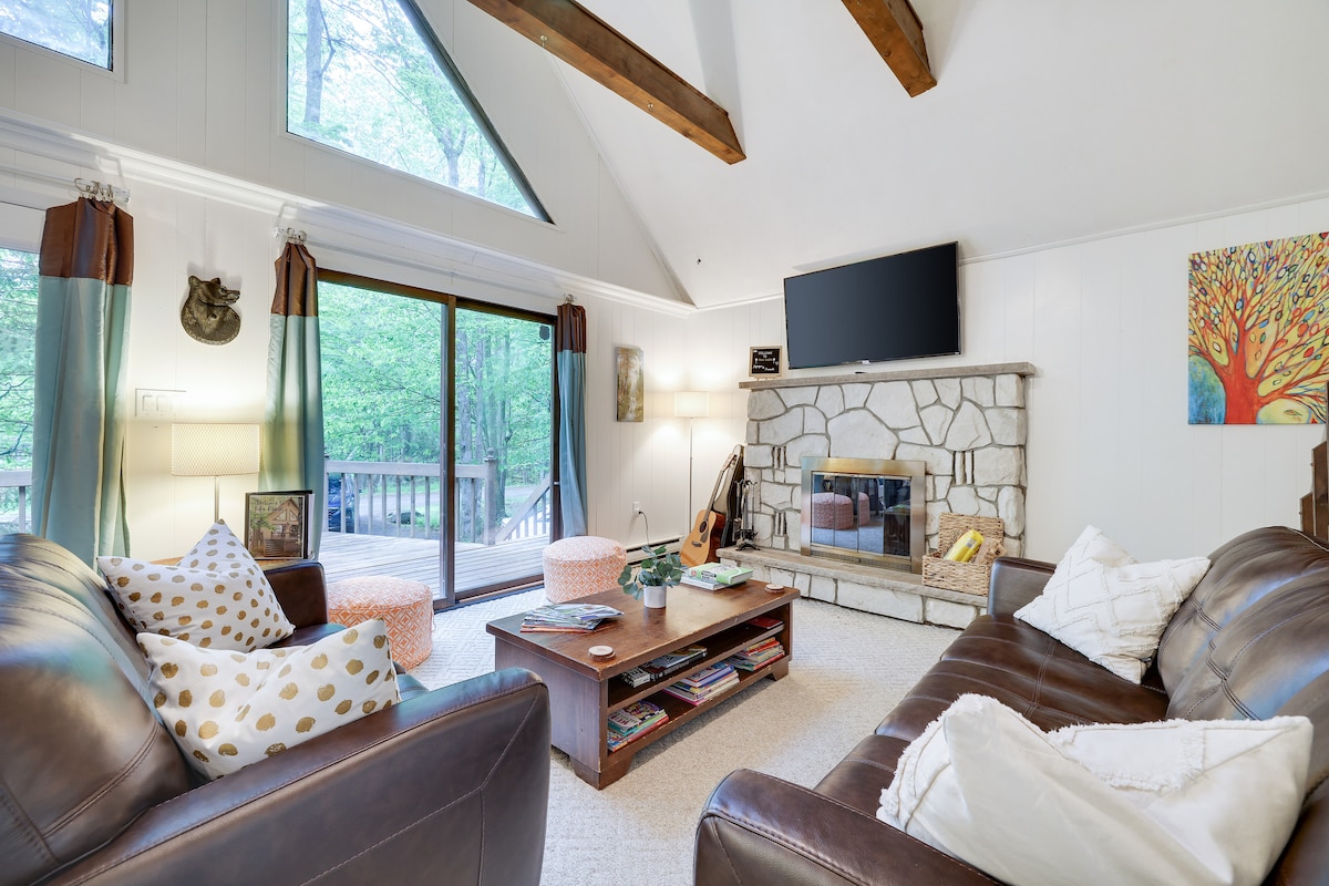 Immerse yourselves in the perfect blend of serenity and romance at our fully renovated Poconos log cabin. It offers a private feel, while located in a safe neighborhood. Cuddle up in our living room day bed while enjoying backyard forest views through the giant picture window. Relax in the hot tub or by the fire pit where memories are made! Centrally located, the cabin provides access to ski resorts and hiking trails. As guests, you'll also enjoy access to the lake, pool, and sports courts.