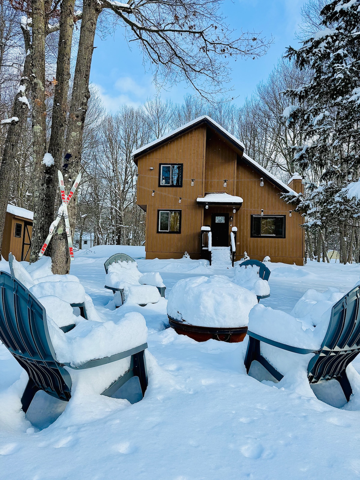 Enjoy this stylish Poconos cabin located a short distance from multiple lakes, skiing, and golf courses.. (please note Lake Naomi is PRIVATE and we dont have a membership) → Smart TV → Solid WiFi → Fully Equipped Kitchen → Hot Tub → Fire pit & Awesome Deck → 13 miles from Snow Ridge Village → 3 miles to Timber trails and Pinecrest Lake Gold Course → 10 mins to Kalahari Waterpark/waterfalls → 20 mins to Camelback Mountain Adventures STR Permit Number #020578 Minimum Age to Rent: 25
