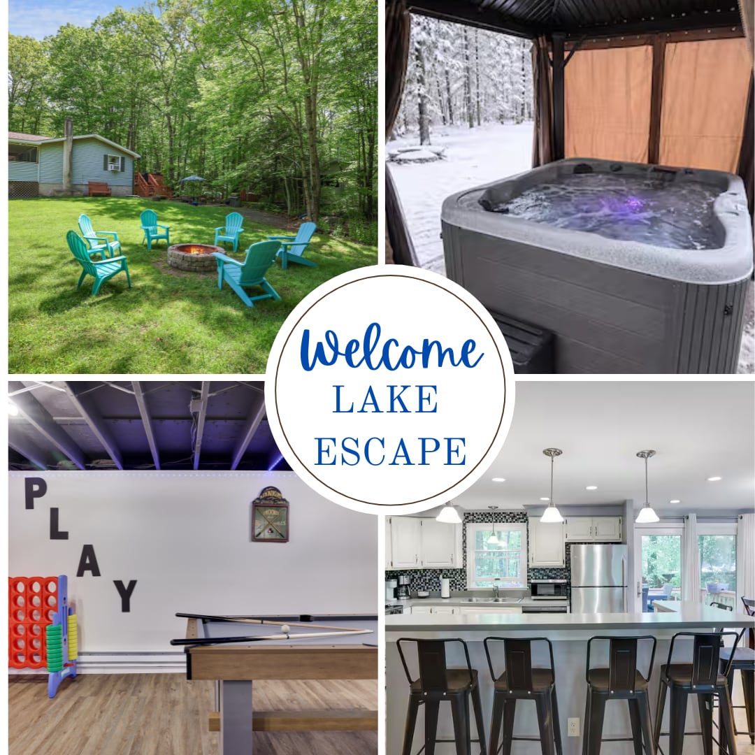Escape to Your Four-Season Pocono Retreat! • Brand New Hot Tub on a covered deck with a spacious lounge area • Game Room featuring multiple arcade games (detached from the main house) • Access to community swimming pool (open 11am–7pm, $5 daily guest fee; hours and availability subject to HOA guidelines and closures) • Private Backyard Fire Pit and BBQ grill for outdoor entertainment • Yoga/Meditation Room to unwind and relax • Lake View just steps from the private beach • 4 Bedrooms & 2 B