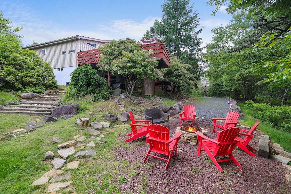 Escape to our cozy MOHWAK KUDIL in the heart of the Poconos for a relaxing & refreshing autumn retreat. Surround yourself with vibrant fall foliage, breathe in the crisp mountain air, and unwind by the fire after a day of exploring the golden beauty of the season. Your perfect fall getaway awaits! This beautiful retreat boasts 5 spacious bedrooms & 3 bathrooms. Outside, enjoy autumn evenings in style with a crackling outdoor fire pit, a soothing hot tub and a rejuvenating Jacuzzi
