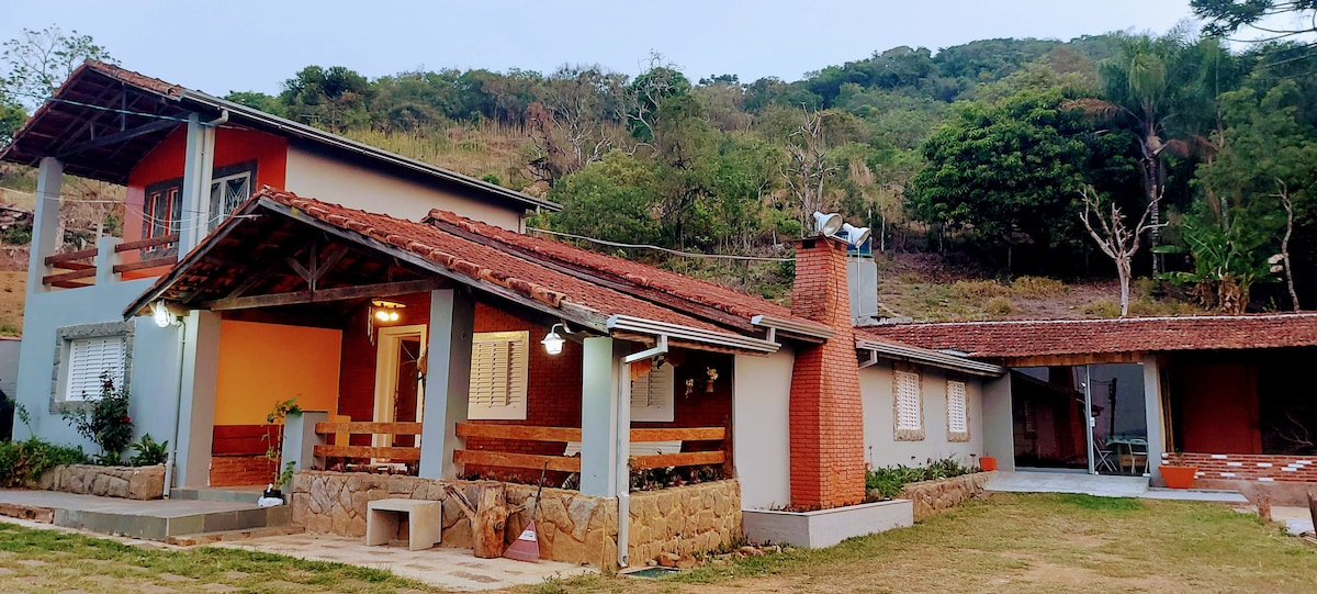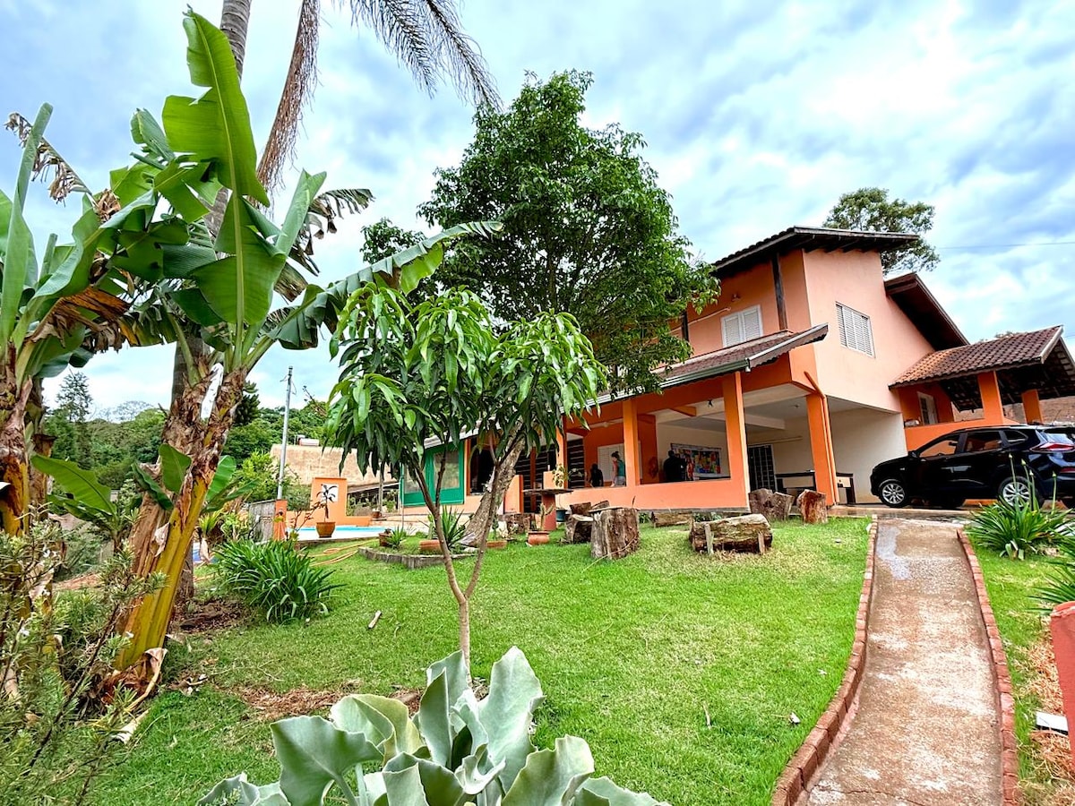Relaxe nesta acomodação incrível. Contamos com espaço amplo, conservado, com muita diversão e comodidade. Ambiente maravilhoso para aproveitar com a família e/ou amigos. Possui vista panorâmica, localizada a 15 minutos de Poços de Caldas - MG. O espaço: 4 quartos, sendo 1 suíte, acomodando 15 pessoas. Possui sala de TV, cozinha, quiosque e duas áreas para churrasco, campo de futebol, piscina, parquinho, pocinho de peixe,mesa de sinuca. OBS: 600 metro de estrada de terra até local