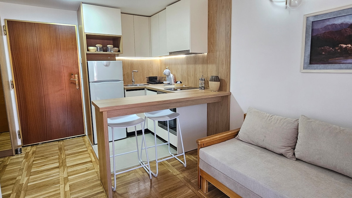 Enjoy your stay at brand-new studio in Podgorica! This cozy space features a convenient Murphy bed, a well-equipped kitchen, and a tranquil balcony for your relaxation. Enjoy the peace and comfort just a 5-minute walk away from the city center and 2 minutes walk to the main train and bus station. Perfect for a delightful stay in the heart of Podgorica!