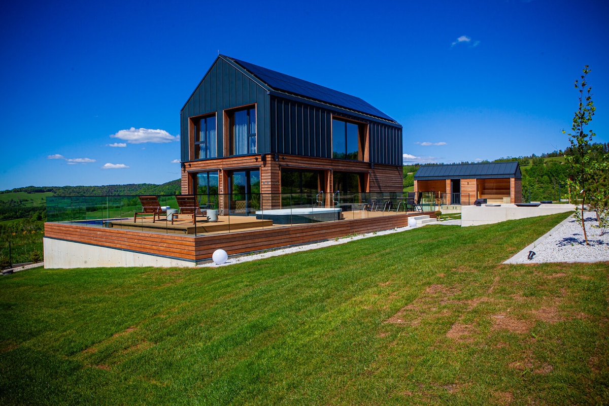A comfortable house with a private pool and hot tub, exclusively for up to 15 guests, located in the village of Futoma (Matulnik), 20 km from Rzeszów. It is close to the Nature Reserve and cycling trail. This is a perfect place for a family retreat or a peaceful getaway with friends, surrounded by nature. Kitchen is fully equipped. Hot tub for an additional fee. The area is surrounded by fields and forests, offering peace, quiet, and birdsong during the day, and a sky full of stars at night.
