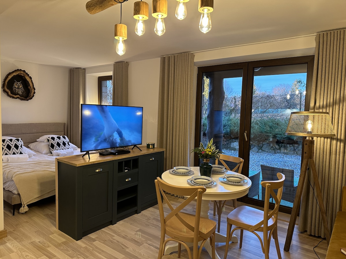 Jasny i przytulny, jednopokojowy apartament zlokalizowany na bezpiecznym, nowym osiedlu niedaleko centrum Rzeszowa, w dzielnicy domów jednorodzinnych. Kuchnia wyposażona jest w płytę indukcyjną, piekarnik, lodówkę, zmywarkę a także komplet naczyń i akcesoriów kuchennych. Część jadalna to stół z 2 krzesłami, zaś część wypoczynkowa w szerokie łóżko z zawsze czystą i wyprasowaną pościelą. Goście mogą korzystać także z przynależnego do apartamentu tarasu.
