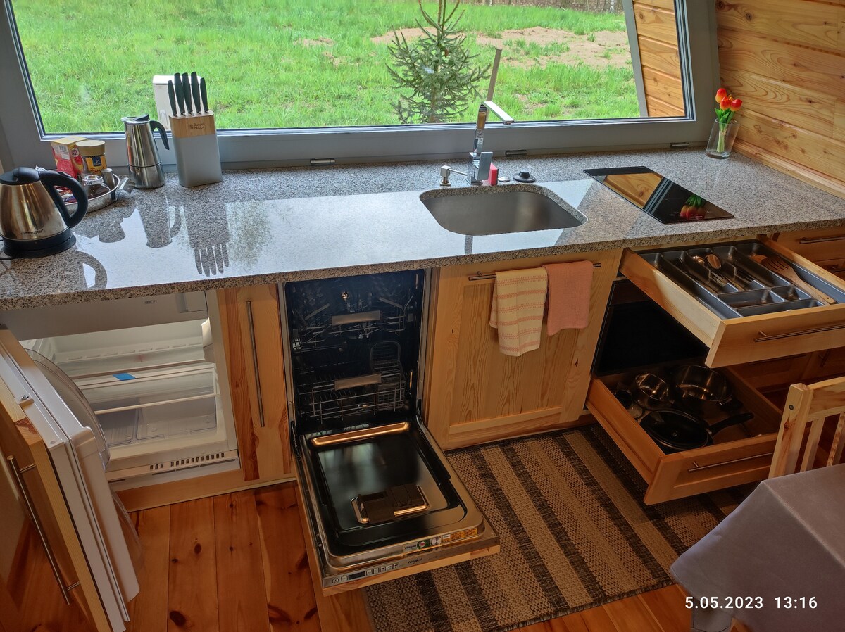 Nasz drewniany domek został zaprojektowany nowocześnie i funkcjonalnie. Staraliśmy się idealnie wtopić w otoczenie i nie zakłócać natury, która nas tu otacza z każdej strony. Nasza mała wieś, nie poddała się czasowi, wszystko funkcjonuje tu jak dawniej. Nie ma sklepu, ani restauracji, brak turystów, tylko cisza i natura. Wieś otaczają łąki i Puszcza Piska, do najbliższych miejscowości 10 km. Żurawie i niezliczona ilość ptactwa wodnego zapraszają na codzienny spektakl. Tutaj odnajdziesz spokój