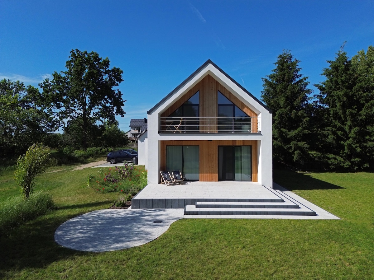 Out of love for nature and interiors, we’ve created house where you can relax, recharge and experience exceptional moments. Everyone will find something for themselves. It is an ideal place to celebrate with loved ones: a spacious terrace encourages slow breakfasts, a fireplace and a hot tub will light up long evenings, a large shelter by the fireplace invites you to feast, attractions for children will keep the youngest busy, and hammocks are an ideal place to listen to the sound of the forest