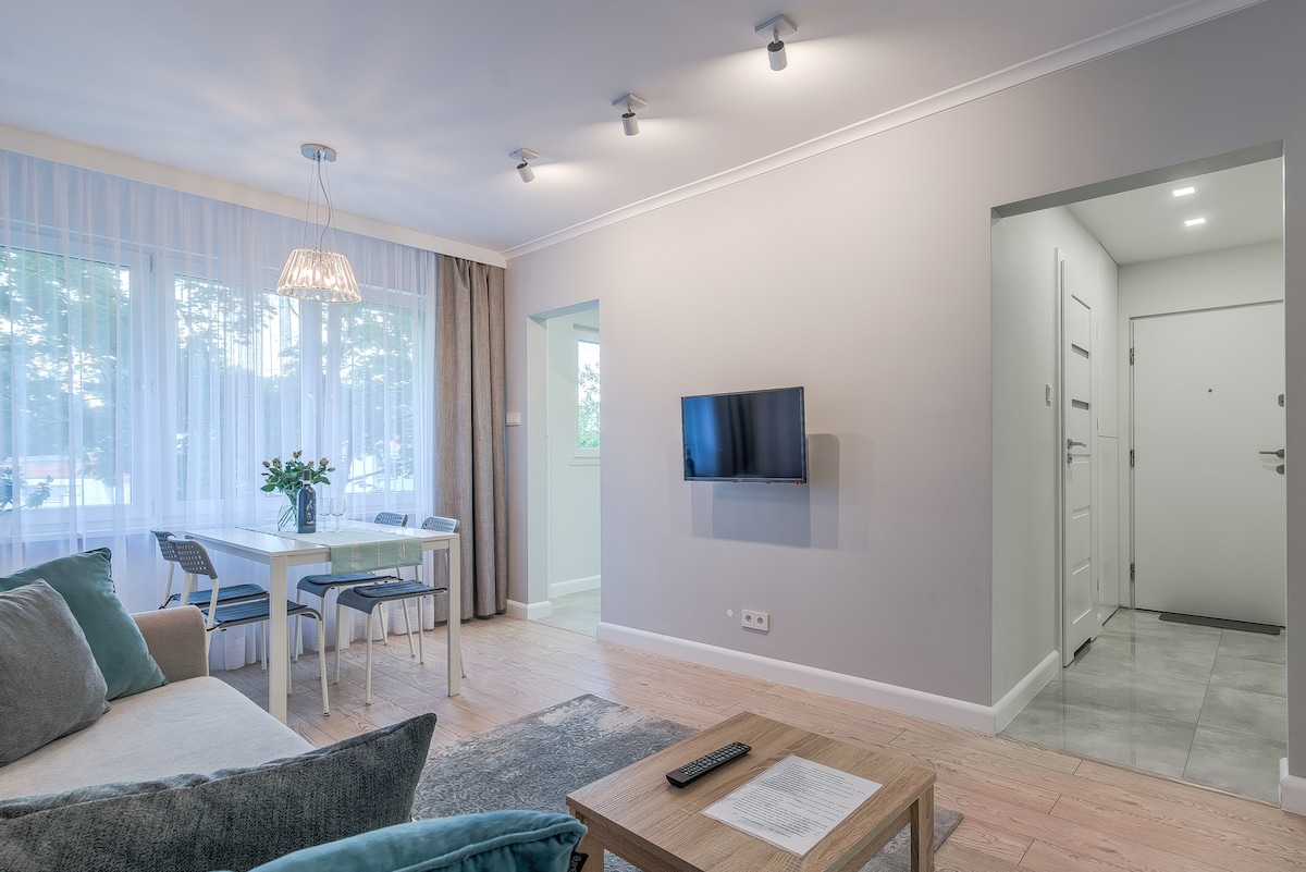 Welcome to AUGUSTÓW – a town surrounded with lakes and the Augustów Forest from three sides. We offer an apartment for rent with an area of 70 m2. The apartment features two rooms, a bathroom, and a large kitchenette – for max. five persons.