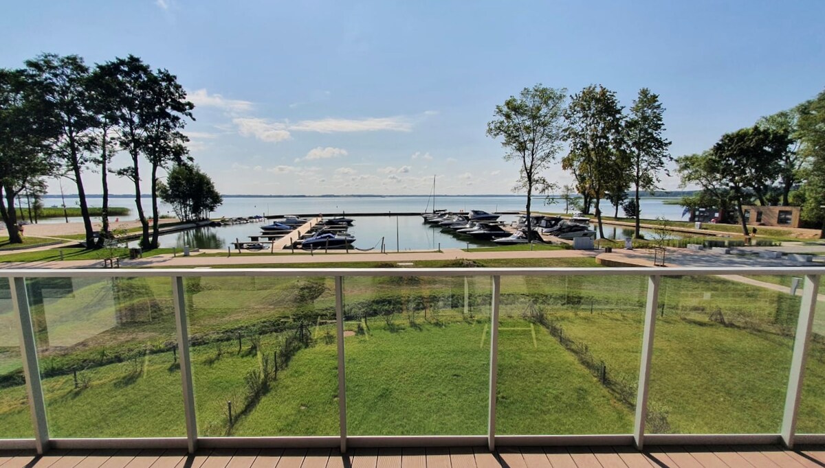 Apartament 60 m2 z widokiem na jezioro w samy sercu Mazur. Apartament został urządzony w eleganckim, nowoczesnym stylu przy zastosowaniu wysokiej jakości materiałów. Wyposażony jest we wszystkie niezbędne urządzenia na krótki jak i dłuższy pobyt. Przeznaczony jest na maksymalnie dla 4 osób. Apartament składa się z przestronnego salonu z aneksem kuchennym, sypialni, łazienki z WC oraz balkonu z widokiem na jezioro. To miejsce idealne na romantyczny wypad lub rodzinny odpoczynek.