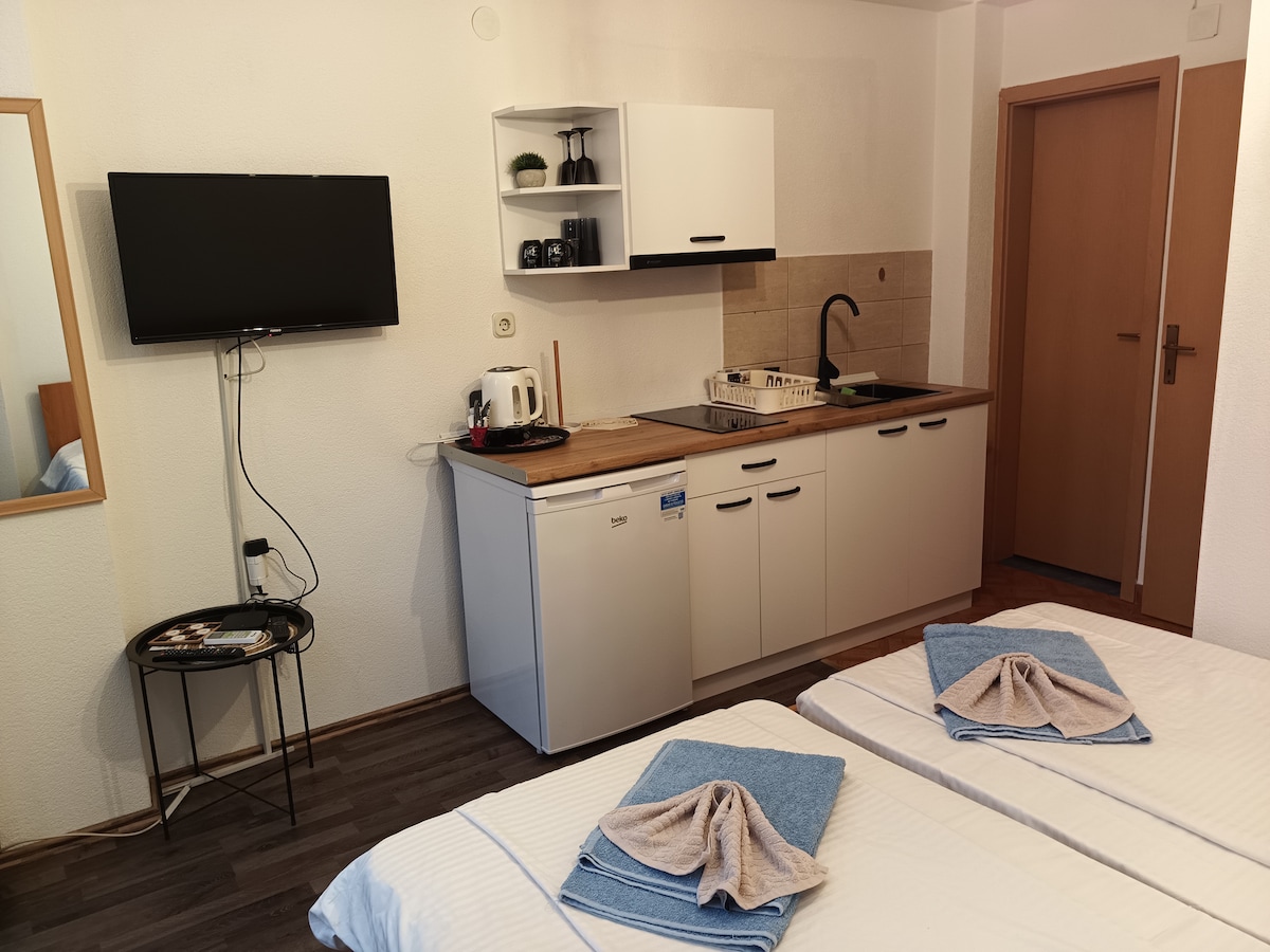 Located 50m away from Upper Gate the apartment is a part of a new house. It features one large living room with balcony overlooking the Ohrid lake, 2 bedrooms - one with 3 beds (1 double and 1 single bed) with balcony and one bedroom with 2 single beds, and 1 bathroom. Fully equipped with kitchen, seating area, washing machine, flat screen and fast Wi-Fi. Parking places are available free of charge close to the apartment. Orhid St. Paul the Apostle Airport is 10 km away by car.