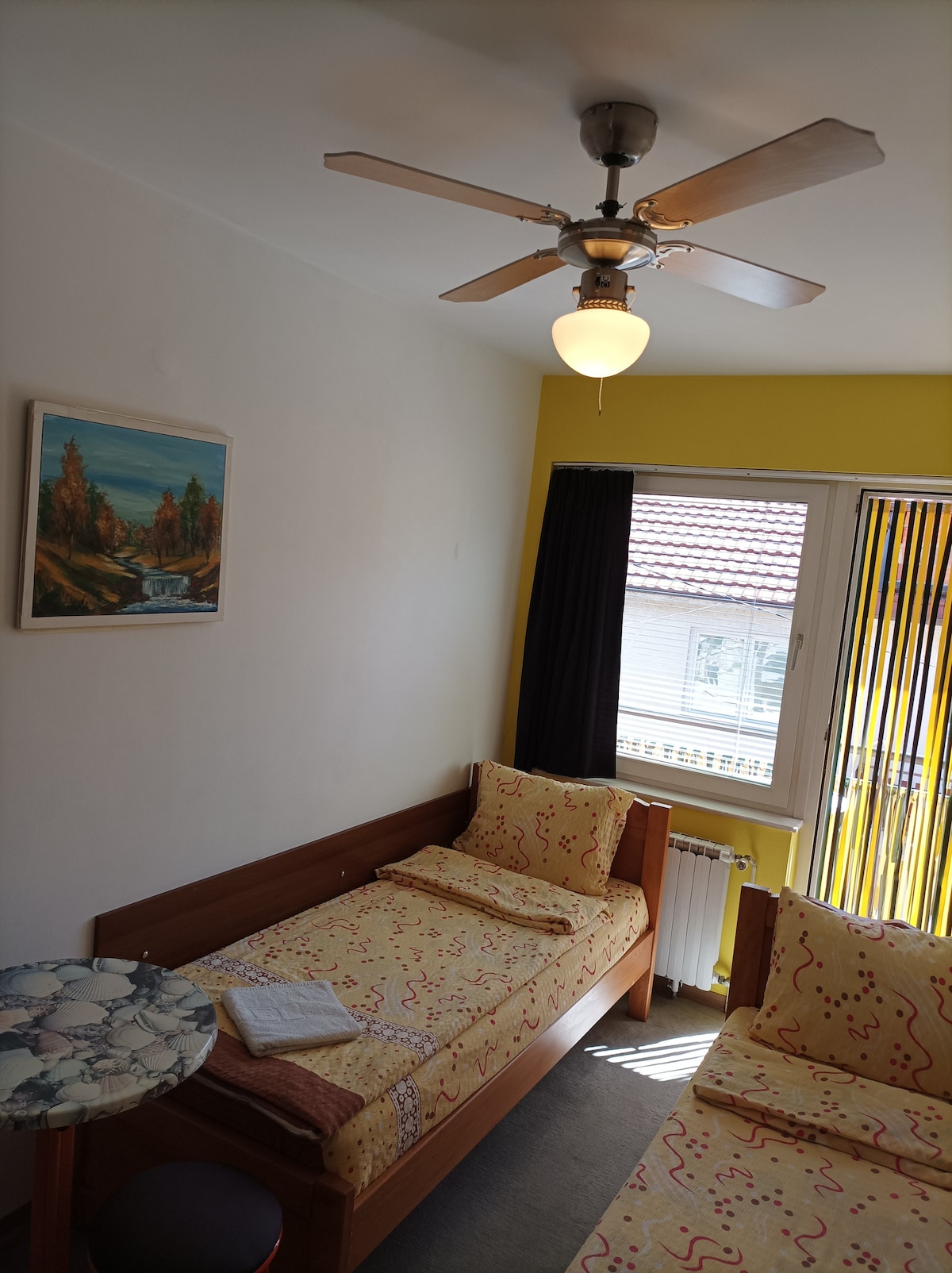 Modern vacation rooms for 2 or 3 guests located in the city center of Pogradec, just a 3 minute walk from the lake. Built in 2025 with brand new appliances. There is air conditioning in the room, TV, Wifi, refrigerator, microwave and an additional sofa in available next to the double bed if you are a group of 3. The bathroom has a washing machine and dryer. Perfect for both short and long stays, these rooms offer more comfort than hotel rooms.