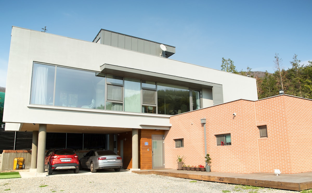 덕동호수의 아름다운 풍광과 소음이 전혀없는 청정지역임. 새 소리와 맑은 공기로 조용히 산책하고 쉴 수 있으며 천년고도 경주의 유적지를 돌아보고, 가까이는 보문호수, 경주 신라 CC를 비롯하여 경주월드, 블루원리조트, 불국사와 석굴암이 가까이 있음. 전원주택 1층 게스트 룸(2층은 호스트 거주)으로 침실 2개, 욕실 2개, 거실, 주방 및 식탁 공간이 있어 가족, 친구모임에 적합함. 이벤트 파티 가능(6명 가능) Luxury, garden House Perfect for Romantic weekend. Getaway Architect designed house offers a tranquil residential vibe atmosphere alongside. Admire the contemporary decor of the open- plan living space and take in the peaceful surroundings from the cute terrace.