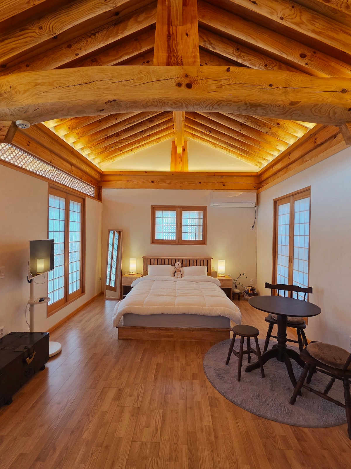한옥의 멋과 현대적인 편리함을 모두 갖춘 이곳에서 특별한 여행을 누려보세요..레스토랑 편의점 관광지 중심에 있어 편리합니다 [이용] -기준인원 4인 ,6인까지 추천 , 최대 8명까지 숙박 가능 -인원 추가금 1인 3만원 (36개월 이상) - 1인 이불, 매트 추가 1인당 2만원 최대 2개까지 가능 (7인이상 이용시 추천) (한 침대에 2명씩 주무시면 6인까지는 커버 가능) [어메너티] -록시땅(샴푸, 컨디셔너, 바디워시, 핸드워시) -샤워 타올, 소형 타올, 핸드 타올 -비상약 [공간 구성] -거실 통창을 통해 보는 한옥뷰, 기와뷰 -포토스팟,사계절 사용가능한 실내자쿠지 -침실3개(퀸침대 3개) [서비스] -숙소 앞 주차 시설 완비(1대 주차 가능) -네스프레소 커피제공 -다도세트 -조식제공 (식빵,요플레,계절과일,라면) [구비물품] -LG TV (스탠바이미 2대) -다이슨 에어랩(롱배럴) -냉장고 -드롱기 전기포트, 토스트기 -전자레인지 -와인잔, 오프너, 식기류