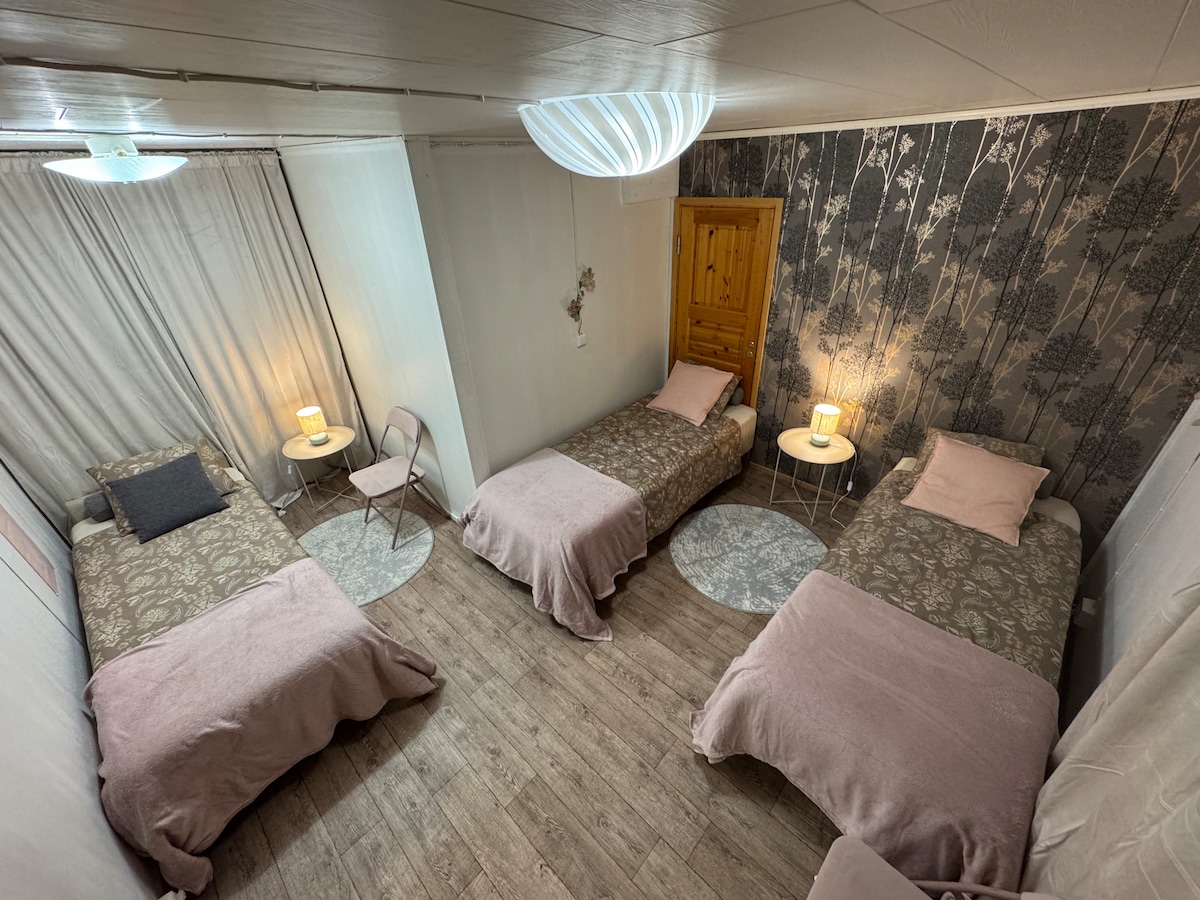 Studio apartment for short-term accommodation. Best suited for 1-2 people but there are beds to 3. Private entrance and the car can be parked right outside the front door. Socket for car engine heater (not for EV-car batteries). Bed linen and towels are included in the reservation. Bed linen is for the number of people indicated in the reservation. Extra towels 5 eur/person. Best suited for those looking for good nights sleeping. Discount for multiple nights.