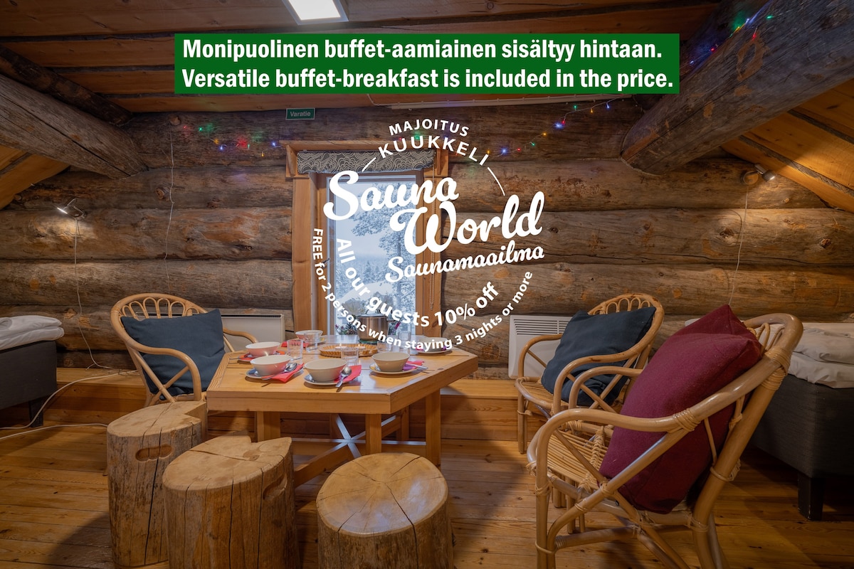 Welcome to our cozy Lappish style log cabin, perfect for family relaxation with a fireplace and sauna. Marvel at the Northern Lights from your window. Enjoy winter sports like tobogganing, skiing and snowboarding, and summer activities like fishing and hiking. We also offer husky safaris with discounts for our guests. Located in Saariselkä's center, close to shops and cafes. Ivalo Airport is 30 km away. Free parking and Wi-Fi.