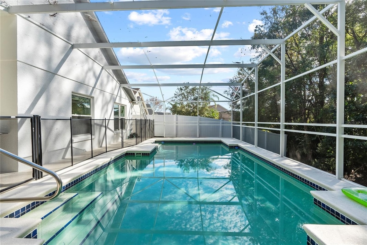 Sit back and relax in this stylish home with all the amenities you need for a fun family getaway. This home has a spacious layout with 3 bedrooms and 2 baths. We have thought of everything so you don't have to-toiletries,washer/dryer, and wifi. Enjoy your morning coffee in the screened in pool area with a beautiful sunrise and lake view or sip a glass of wine while floating in the pool. Just minutes to Theme Parks and major highways, this is the dream home you have been waiting for!