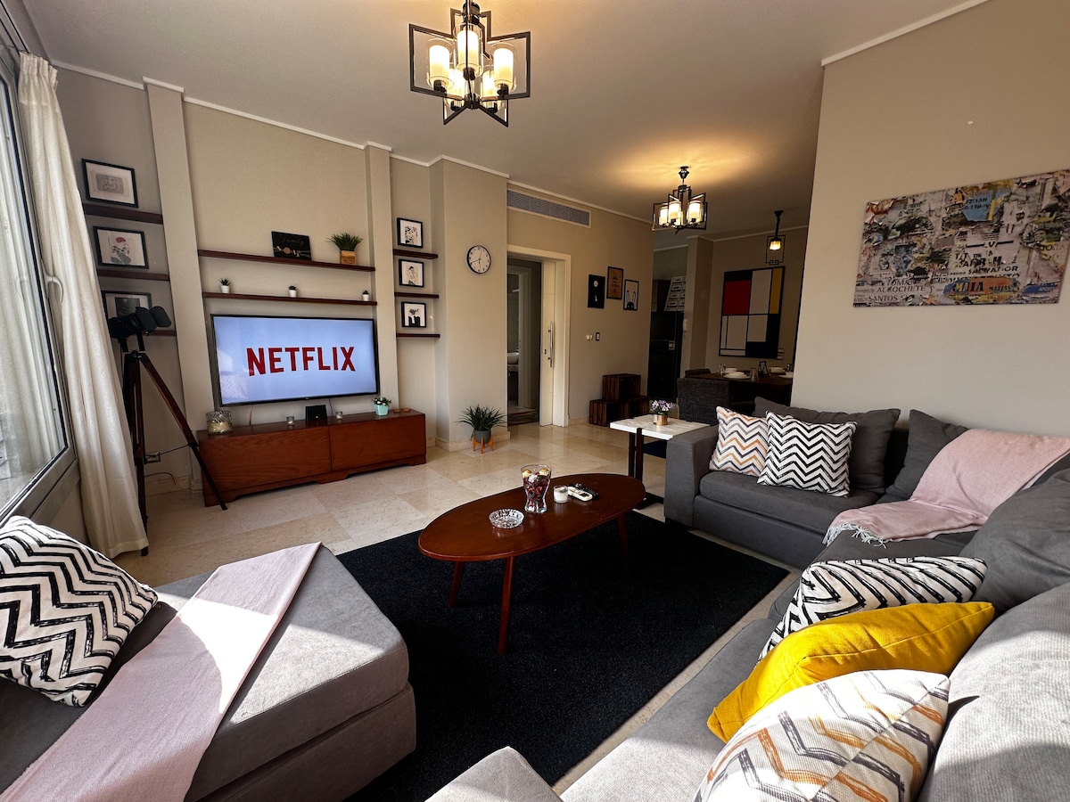 Enjoy watching the 55” Samsung TV and fast internet while sitting on the comfortable sofa. It is located in one of the finest gated communities in New Cairo. About 30 minutes from the airport. It is centrally-located in a walking distance to malls and the AUC. It’s located in Village Gate compound. It’s close to point 90 mall. Close to what malls can offer from supermarket, Cinemas, shops, Paul and fancy restaurants. About 42 km to the pyramids.