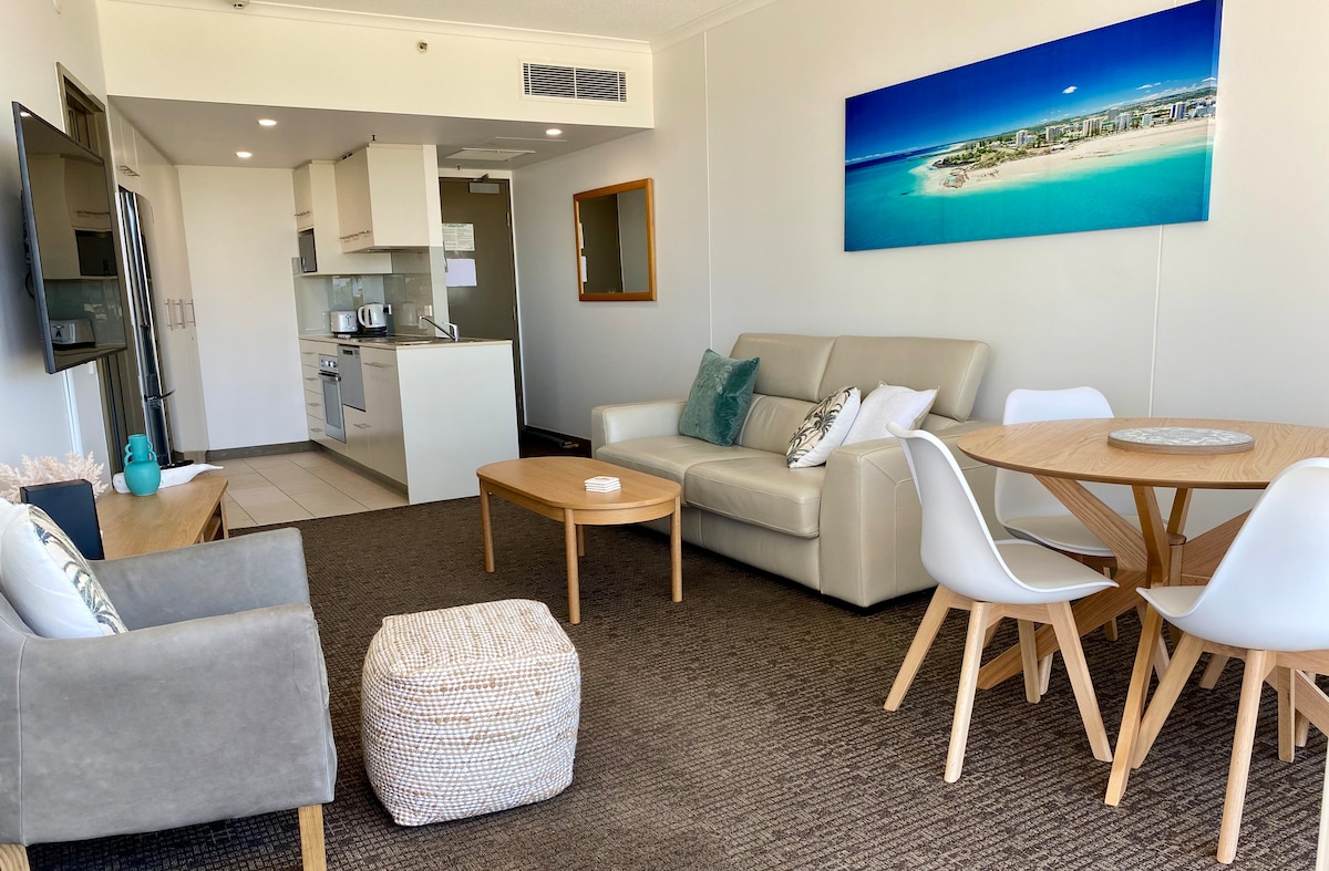 Oaks Gold Coast Calypso Plaza Suites is a premium, family-friendly Coolangatta hotel just minutes from Gold Coast Airport and situated opposite beautiful Coolangatta Beach, the 4.5-star resort features a huge swimming pool, water slides, gymnasium, outdoor spa, Sauna and direct access to the foreshore of Coolangatta beach. Our apartment is a 1 bedroom with a kitchen and living dining area and its own balcony.