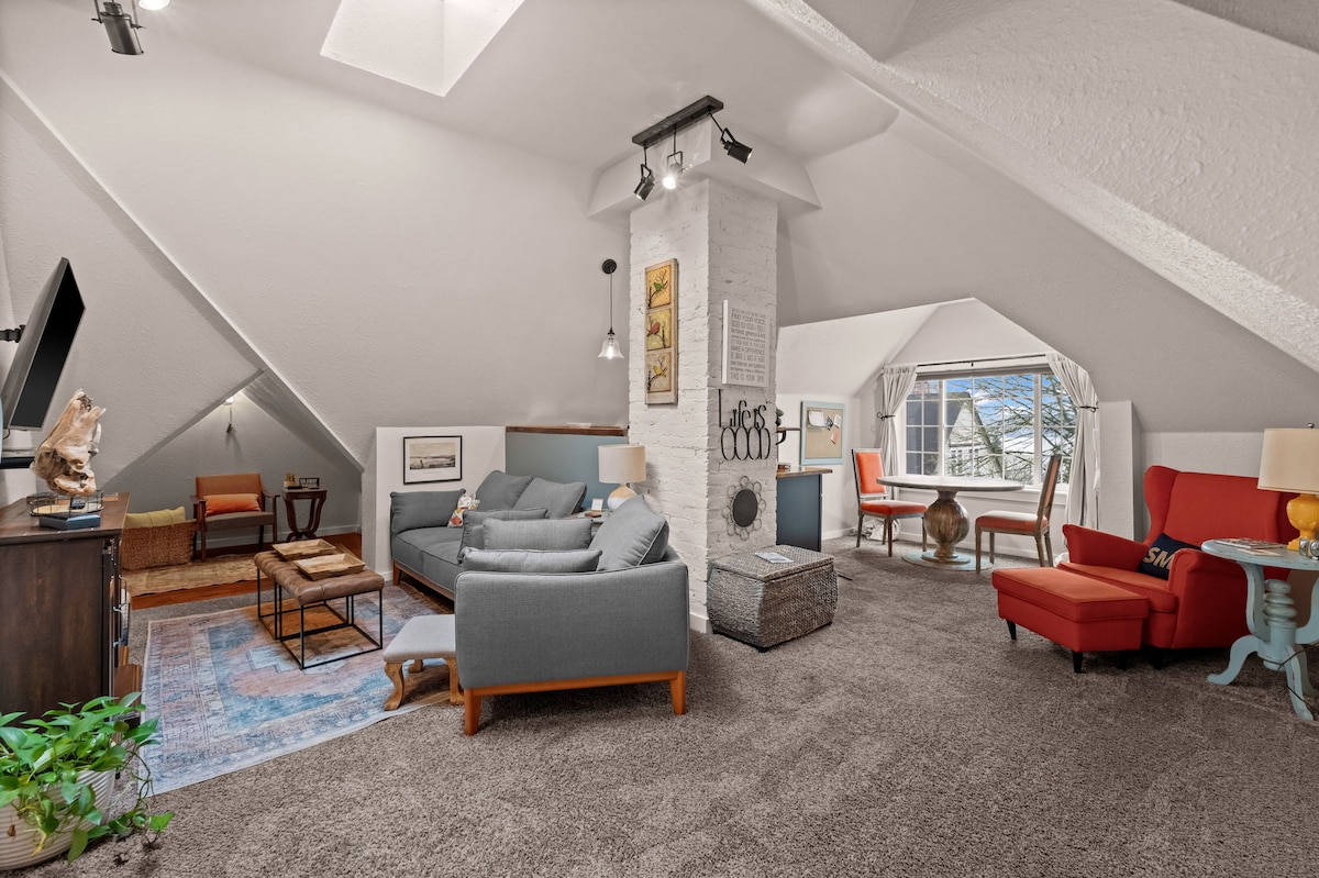 Experience a blend of history and modern luxury in this quiet Loft. The upstairs apartment features original brick accents, an open concept lounge space, sloping architectural ceilings, and classic furnishings. You will feel like you are on top of the world in your own private suite that occupies the entire top floor of this Historic Victorian home! This updated, beautiful, living space is perfect. The Kitchenette has what you need to cook a meal. Coffee, tea, and a small snack will be available upon your arrival. Enjoy partial sunrise views in the morning while having coffee at your dining table. Then enjoy the warm sunset and a glass of wine on this homes beautiful front porch. The master suite includes a luxurious rain shower and romantic sleeping area with sunset and rooftop views to the sound! Shampoo, hairdryer and ironing board, luxurious bedding and towels provided. Warm cozy fireplace with soft throws for the chilly day. Roku, DVD player, with a large selection of CDs, and the internet will be ready for your convenience. Just want to read or meditate, perfect space available for that as well. Cleanliness and communication are most important to the Super Host. Keyless, private entrance includes a small patio to enjoy. There are three options for parking. Please see pictures for the view of stairs leading to the apartment. Worth the climb! Perfect top floor retreat! NOTE~ Keyless code and parking instructions provided on the day of arrival.~ We love our community and are here for any questions you might have. Your space has been set up to be all yours. Most questions can be answered before arrival. Very little interaction is necessary! But we are here if you need anything! The property is just steps away from The Weyerhaeuser Mansion and stunning Puget Sound views. Enjoy a peaceful walk through a quiet neighborhood while soaking in the peaceful surrounding. Discover the area's many shopping and dining experiences! (URL HIDDEN) Bus stop 2 blocks away. 42nd and Cheyenne *Parking Space and Keycode will be provided on the day of your arrival. * Please read all rules and view all pictures. This is a wonderful space but may not be for eveyone. That is up to you to decide. We do our best to be transparent. We want our guest to be happy. * Please click on this link to see additional an room in the house. https://abnb.me/bpdPYn3ijR. * Text any questions at any time. * Have a great day!