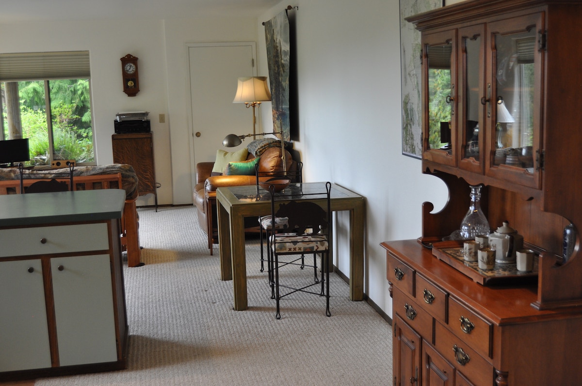 Welcome to a place of peace, restoration and comfort. With its own private entrance, you will have the downstairs apartment in our gorgeous island home, surrounded by massive cedar and fir trees, lush landscaping, and a beautiful, large pond. Wander down to the pond, sit, meditate, absorb the pervasive peace of this property. Apartment amenities include washer, dryer, wi-fi, cable TV, fully-appointed kitchen. We also have a PacnPlay with sheet, if you have an infant/baby up to 2 years.