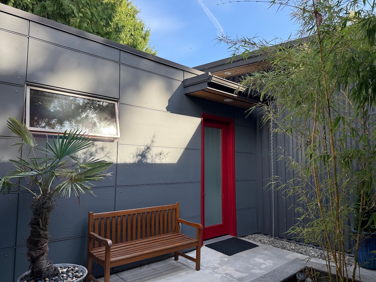 Quiet, self-contained 400 sf studio in a modern home with full bath, kitchen, private entrance and secured parking with EV charger. Comfortably furnished with 1 queen bed, 1 full sleeper sofa, office desk, media center, fridge with ice-water dispenser, stove, curb-less shower, washer and dryer. Large sliding glass doors to a patio and 150' high cedar, madrone trees. Effortless access with no stairs or steps. Warm radiant water heated polished concrete floors, AC and plenty of ventilation.