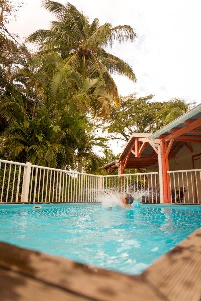 In a setting of tropical vegetation, our small family structure is made up of three independent wooden bungalows around a large salt pool. Depending on the season, you can enjoy the many flowers and fruits in our garden. We are located on the heights of Deshaies, 50 meters from the Botanical Garden. Breakfast in supplement is served on reservation and in complete privacy on your terrace.