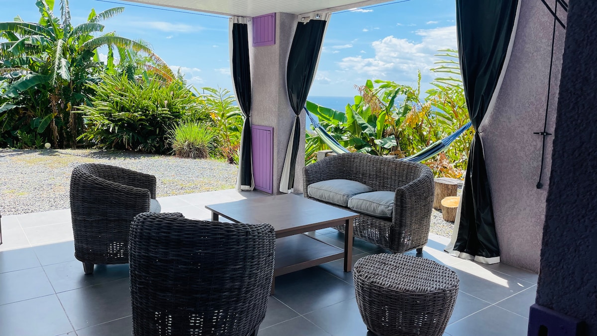 Independent bungalow within a small structure of 4 gîtes. The air-conditioned bungalow consists of a double bed with a mosquito net, a shower room with sink, washing machine and WC and a safe. The covered terrace consists of an equipped kitchen, a table, 2 chairs and a hammock, view of the swimming pool and a large private open terrace with an incredible view of the Caribbean Sea and Pointe-Noire.