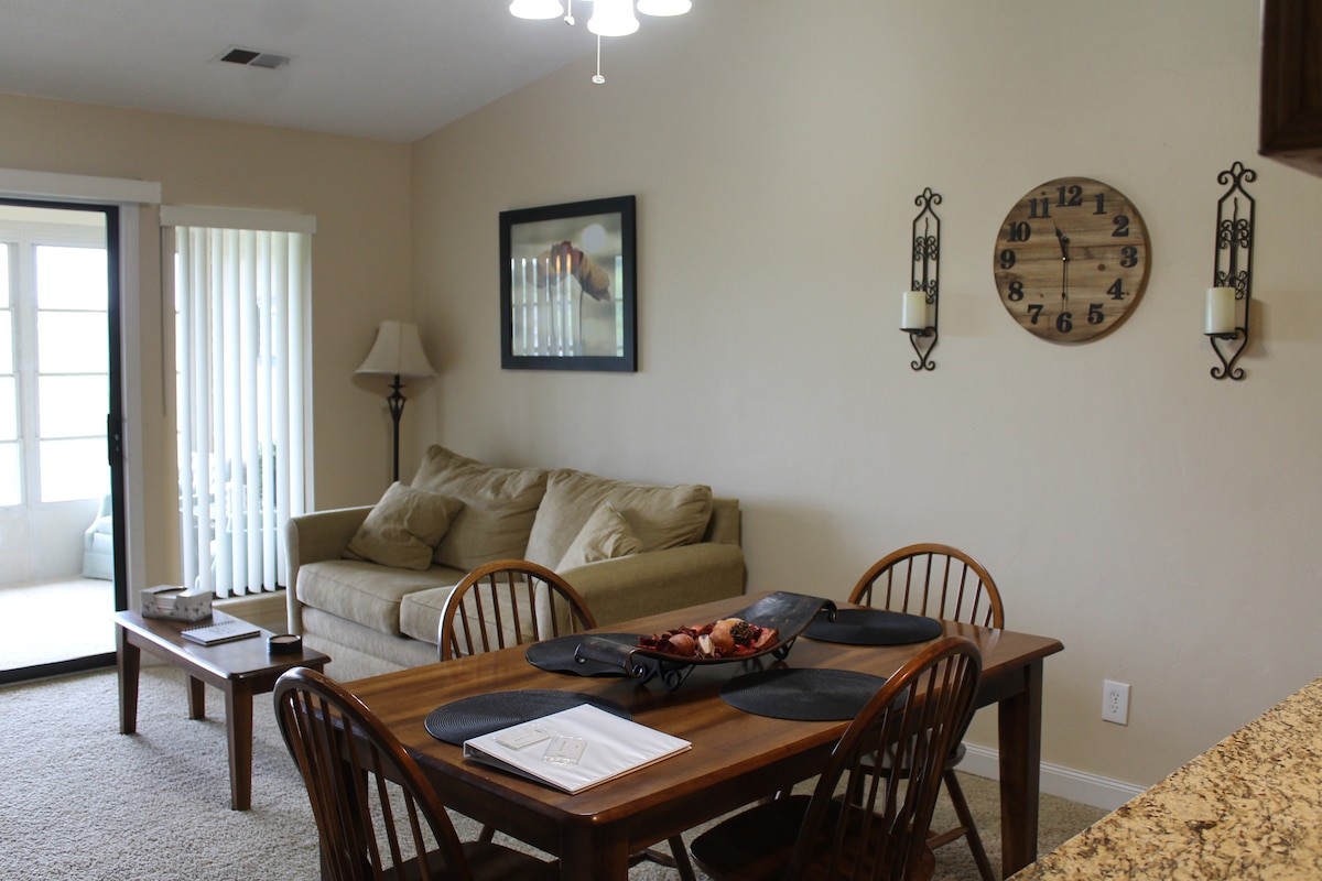 Enjoy Branson in style and comfort!! 1 BR/1 BA living & dining rooms & full kitchen. The kitchen is fully stocked for cooking. Condo has shampoo, soaps, coffee, full kitchen, towels, sofa sleeper, cable TV, free Wi-Fi. Located near the strip in the PR gated community near the clubhouse on the 17 tee box. A golf discount is available for $60 per person golf & cart. Park outside the front door. Also tennis & pickel ball. Pointe amenities include, indoor/outdoor pool, fitness room, grill & bar.