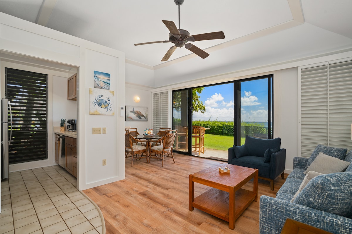 Remodeled ground floor, corner unit in exclusive Bld 11. Steps from beach! Whole home A/C (dual split in living room & window unit in bedroom). New cal king bed, queen sleeper sofa & mini twin in the living room. Sleeps up to 5. Super fast wifi. Private lanai steps out to expansive gardens & Twin Bridges. New living & dining furniture! 65” Smart tv. Unit is supplied w/extra amenities, suggested experiences & babysitting recommendations around the island to offer a fantastic & unforgettable stay!