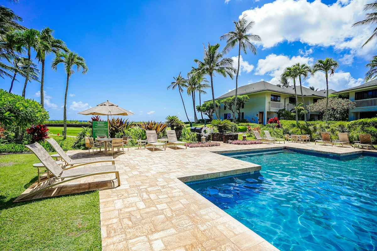 This amazing bright and open condo in is sure to make your vacation fantastic! The perfect place for couples and small families to enjoy the amazing island of Kauai. Enjoy coffee or dinner on the covered lanai with gorgeous ocean views. This centrally located condo is beachfront (5 minute walk)and within walking distance to the luxurious amenities offered the athletic club pool and gym, restaurants, coffee local shops. All costs, fees and taxes are included here in Airbnb!