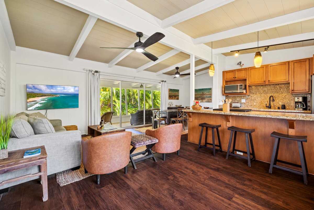 This bright and airy updated condo is the ideal place to stay in sunny Poʻipū for couples, honeymooners + small families. The open living space is clean and welcoming with a coastal boho vibe, and you'll enjoy beautiful ocean + garden views from the huge upper-level lanai. Location is the absolute best - from the beachfront property, you can walk to several of the best beaches on the south shore, local coffee, restaurants, shops, and the incredible pool within minutes.