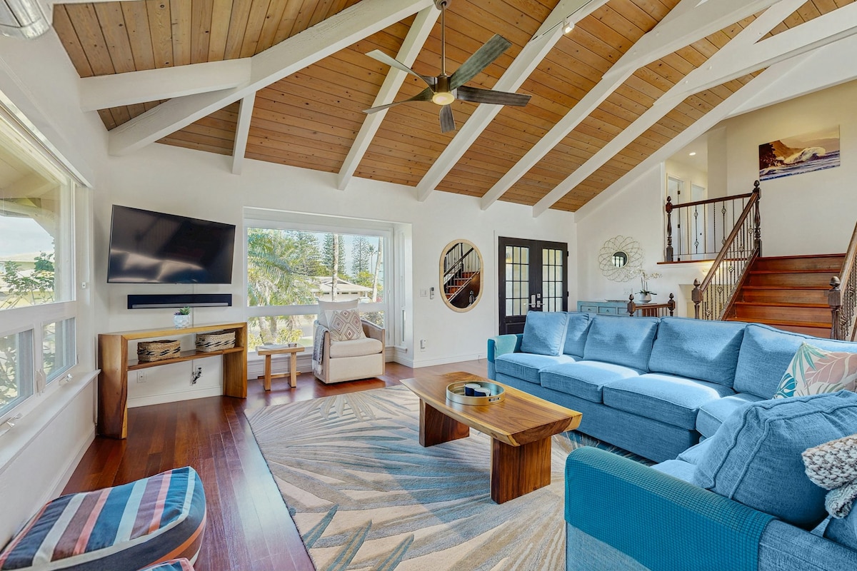 Welcome to Hale Hui Kai, your Gathering Place by the Sea. This spacious three-bedroom plus den retreat in the heart of Poipu Beach Estates. Designed for families and friends to come together, this inviting home combines the ease of island living with modern comforts, including air conditioning in the bedrooms. The open great room, gourmet kitchen, and private lanai create a seamless flow for cooking, dining, and relaxing, while lush tropical surroundings provide a true sense of retreat.