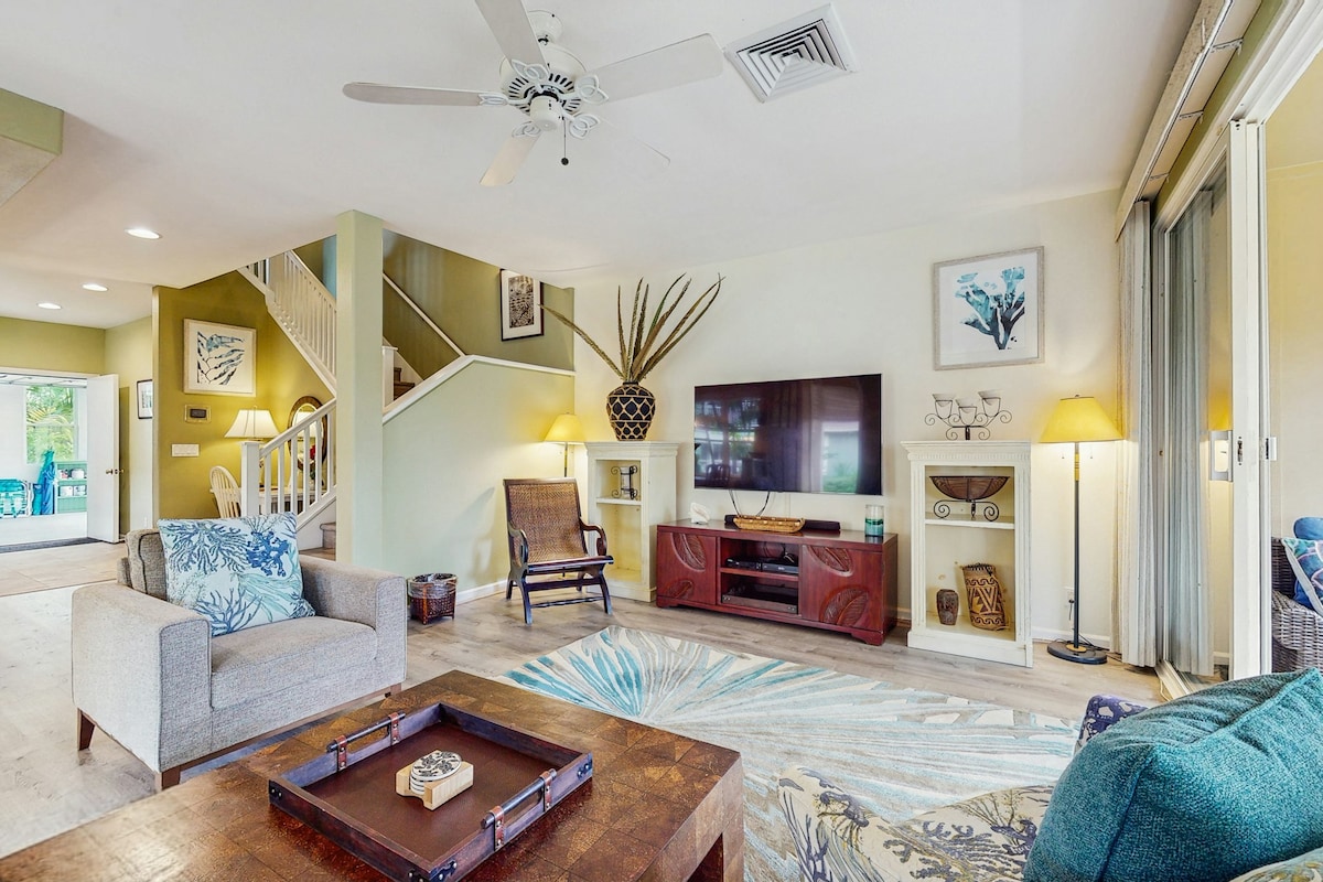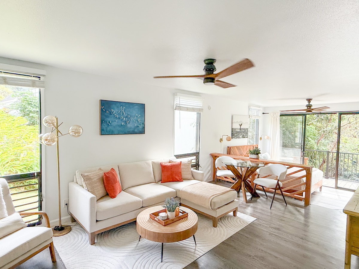 NEW! AS SEEN ON HAWAII LIFE! Season 14, Ep 4, House 2 Updated 2bdrm/2 bath Townhome with 3 queen beds! Enjoy our updated 2 bdrm, 2 bath condo with modern amenities in Princeville. Our end unit means a larger feel with natural light & no upstairs neighbors. Our quiet location is next to golf courses, the Westin Resort where you can enjoy Starbucks & fine dining. Hike down to Wyllie Beach, shop at the nearby Princeville Shopping Center, hike to Queens Bath and explore nearby Hanalei Bay.