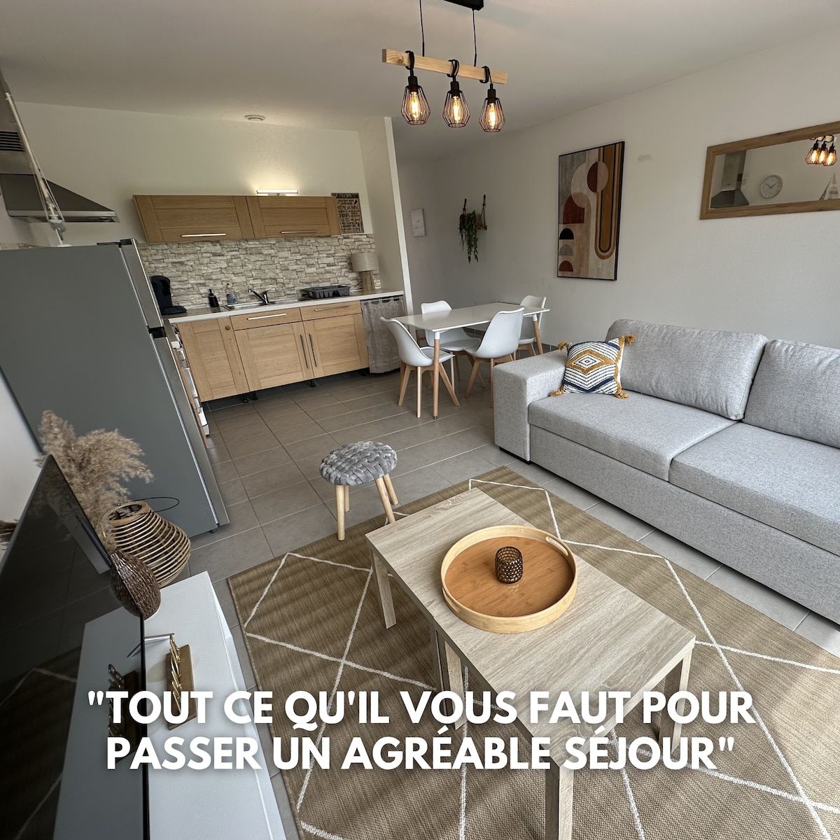 Modern, comfortable house with a south-facing garden offering complete privacy. Perfect for relaxing in a quiet neighborhood, 10 minutes from La Rochelle. The 50 m² (538 sq ft) accommodation includes a large living room with a double sofa bed, a fully equipped kitchen, a bathroom, a spacious bedroom with a double bed, a travel cot, and two private parking spaces. The house is decorated in a contemporary style, ideal for spending quality time with family or friends.