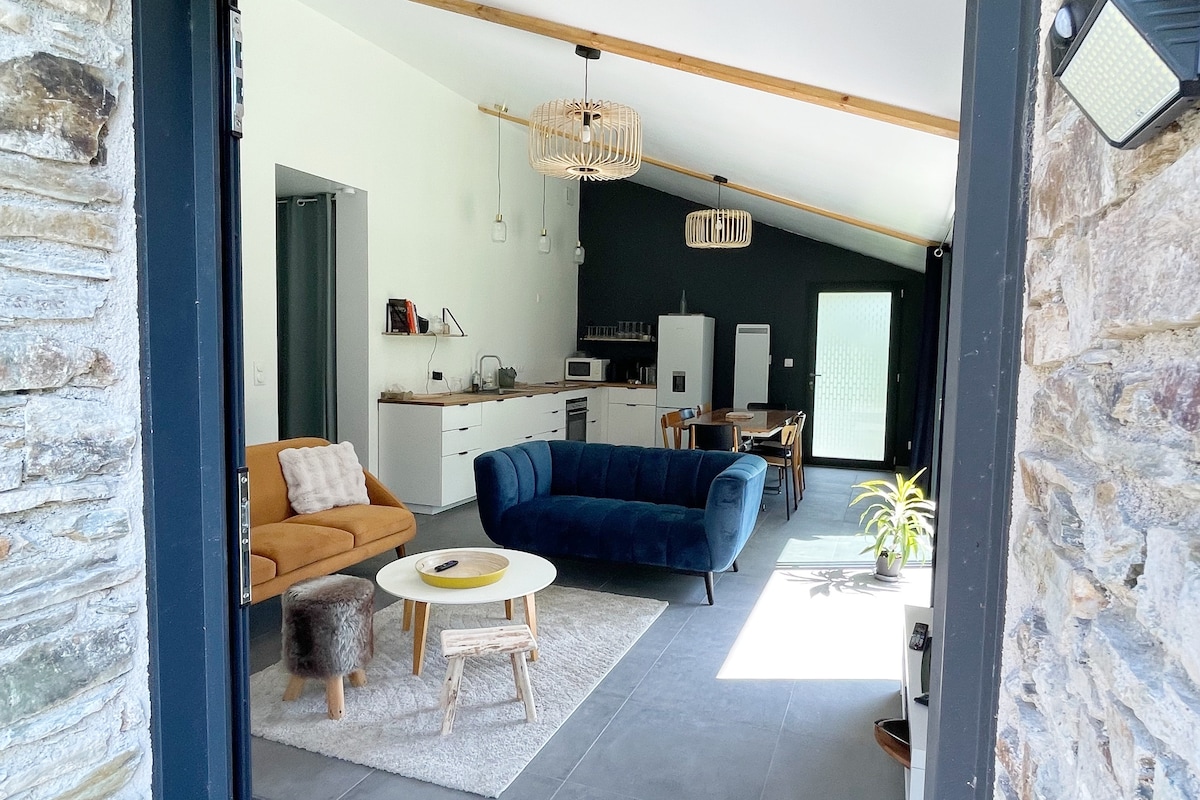 Respect du protocole de nettoyage renforcé établi par Air BnB Gîte de 130 m2 aménagé dans une ancienne grange réparti sur 2 niveaux. RdC : pièce de vie avec coin cuisine et coin salon. WC séparé. 1 chambre avec salle d 'eau privative (+ machine à laver). Etage : 1 chambre avec salle d'eau privative + couchage pour 2 enfants. WC séparé. Extérieur : cour anglaise de 93 m2 avec salon de jardin + barbecue + parasol + bains de soleil. Espace vert non cloturé accessible côté gîte et côté maison.