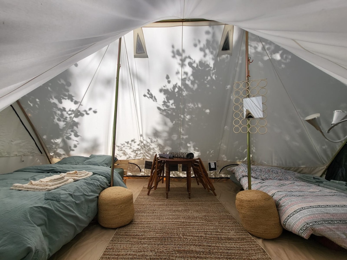 This lovely luna bell tent is a perfect family base. With a double bed, two single beds and small seating area, the higher headroom gives a spacious but cosy feel. Each tent comes with 100% cotton linens, solar lighting and lanterns and blankets for when the sun goes down. You will have your own private eco bathroom with solar shower and composting toilet as well as an outdoor cooking area with equipment and gas BBQ. In our on-grid shed you will find a fridge, freezer and small honesty shop.