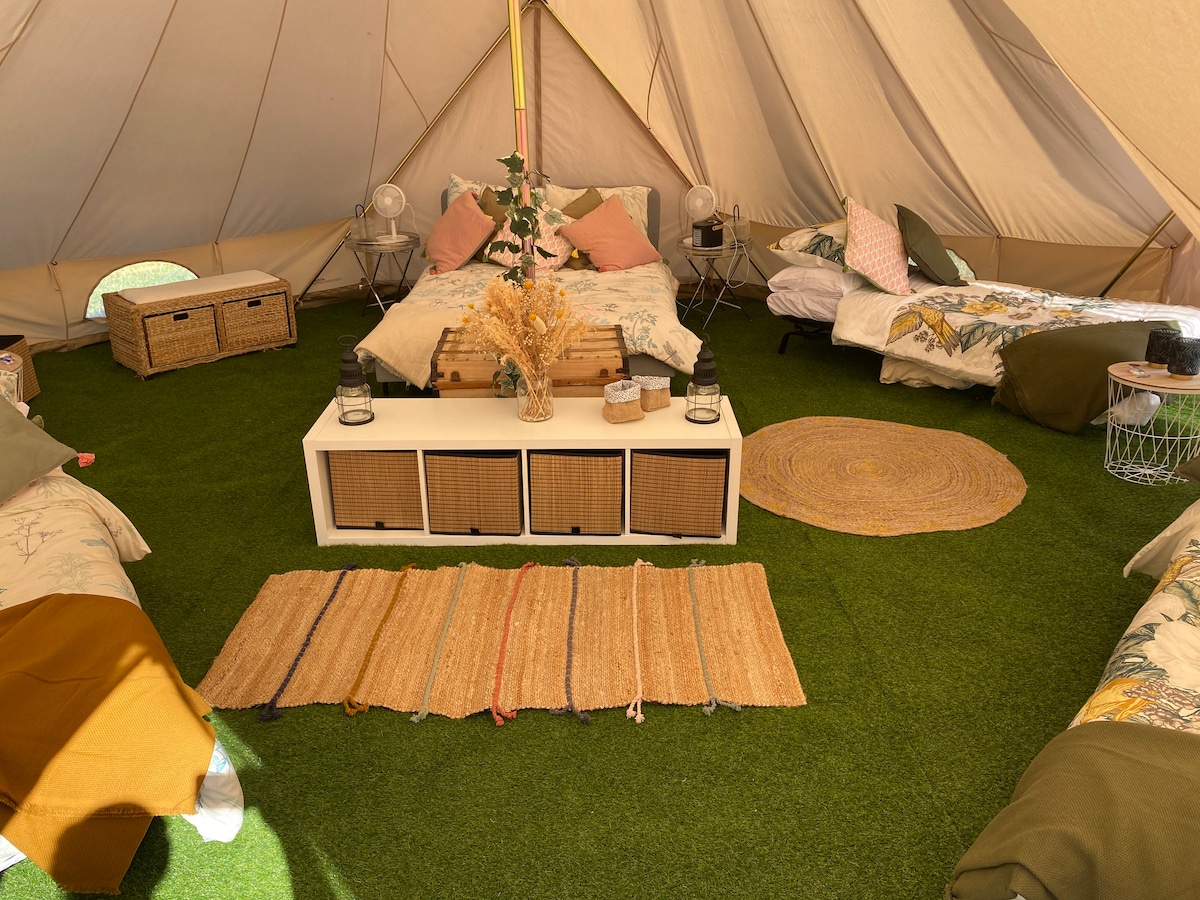Camping pratique : Apportez seulement vos duvets ! A l’ombre des arbres 2 tentes de 4 pers. (2 matelas de 140X190cm avec housse et oreillers avec taies) installées sur une plateforme en bois sur pilotis + salon de jardin . L'ensemble peut accueillir jusqu'à 8 pers, MINIMUM 4 PERSONNES. Même si vous n'occupez pas tout, nous n'ajouterons jamais d'autres personnes. Intimité préservée. Vous êtes moins de 4 ? Notre "prêt-à-camper" Bois Charmant sera idéal pour vous ! (voir autre annonce).