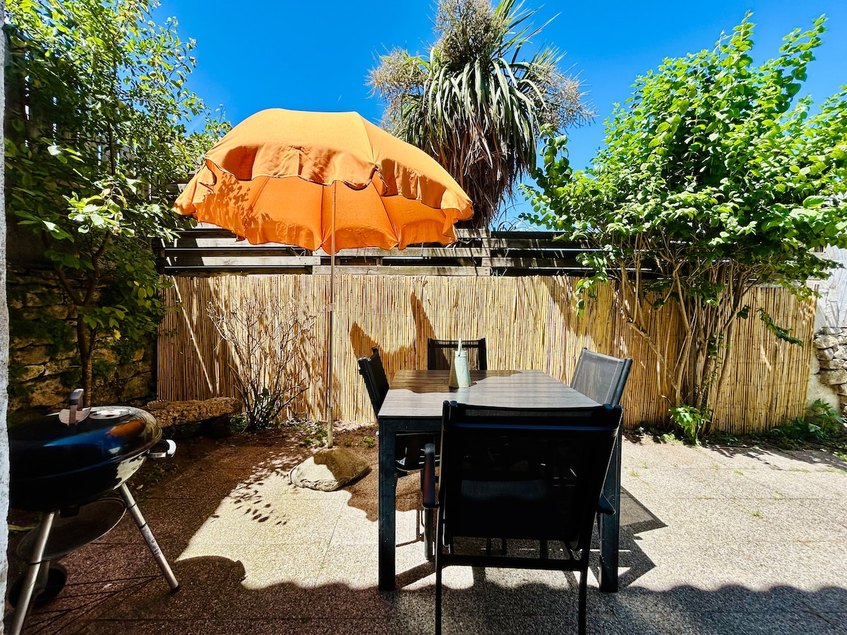 Dans 1 maison du XIXEME pleine de charme, 1 gîte pour 1 famille de 4, refait à neuf, totalement indépendant, très bien équipé, avec son jardin, sa terrasse (BBQ) et sa place de parking privative. Composé d’1 pièce de vie de caractère de 30m2 avec 1 Cuisine équipée, 1 Coin repas et 1 Coin TV (box), 1 chambre double (lit en 160), 1 petite chambre pour 2 jeunes (2 lits simples empilables), 1 salle d’eau avec WC, 1 local à Velos. Équipement bébé sur demande. Les lits sont faits à votre arrivée