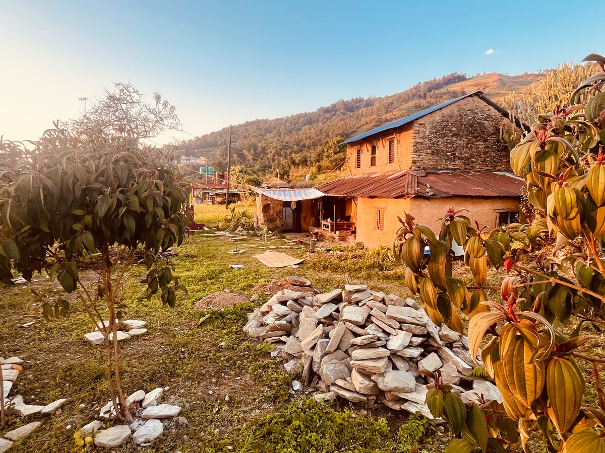 Experience vernacular Nepali living with modern luxury in our round house built from stone, wood, and mud—reinforced for safety. It features antique carvings, 3 cozy bedrooms, full bath, English toilet, and a separate Japanese bathhouse with hot tub, sauna, and rooftop views of the Annapurna range. Surrounded by gardens and verandas, it’s a peaceful retreat just 10 minutes from Lakeside—where village charm meets city convenience.
