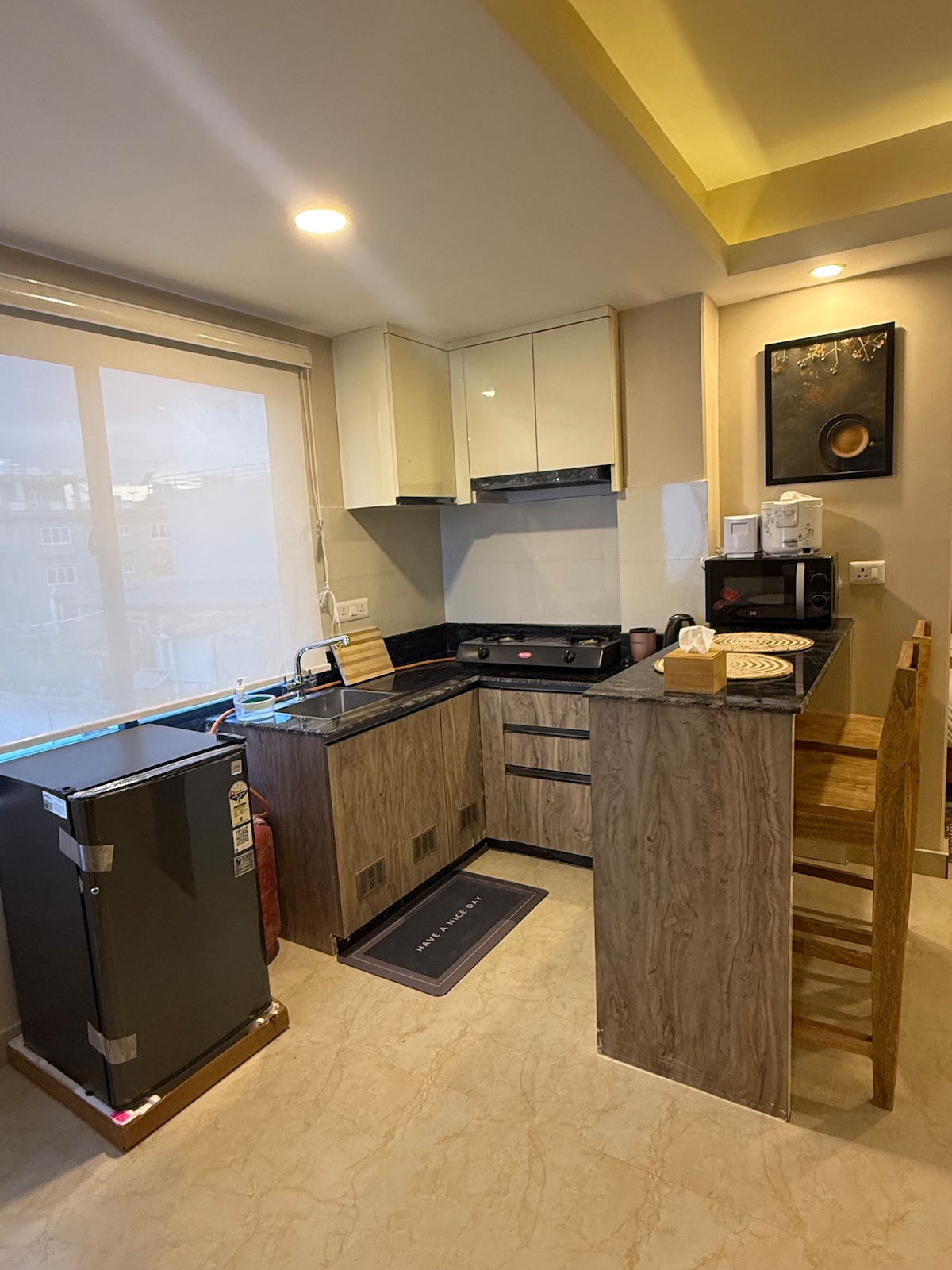 We are situated at 10 minutes walking distance from the touristic hub lakeside and 100m inside Main Street . A small and beautiful hiking hill behind the apartment building. This location is recognized as one of the harmonious and tranquil areas of Pokhara city. Similarly we respect western cultures as we are well known about it, having business in the hospitality sector.