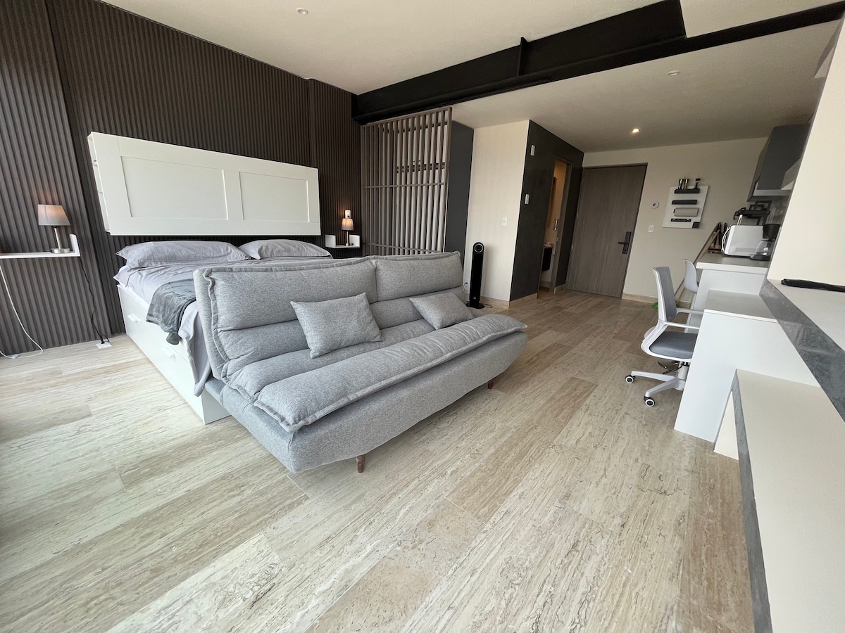 Hermoso estudio situado en la exclusiva zona de Polanco, muy cerca de centros comerciales, boutiques, parques, restaurantes, bares y cafés de esta enorme ciudad cosmopolita. ¡Con seguridad no existe un mejor lugar para hospedarte en Ciudad de México! Construcción nueva y moderna, vigilancia 24 h, un cajón de estacionamiento gratuito y elevador. Área de coworking, juegos, gimnasio completo, zona de yoga, rooftop con mesas, hamacas para relajarse o leer un libro y hermosa vista de la ciudad.