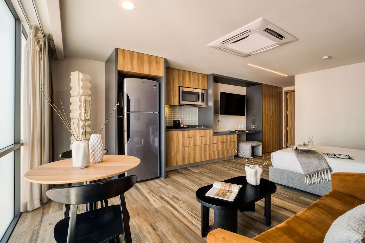 Stay in Roma Norte, Mexico City’s trendiest neighborhood, surrounded by top restaurants, cafés, galleries, nightlife, and cultural landmarks. This modern studio includes a Queen-size bed, a sofa bed, a Smart TV, a dining table, and a work desk—ideal for relaxing or being productive. Enjoy access to premium shared spaces: a fully equipped gym, a game room, and a shared terrace with incredible views of the city. Live CDMX like a local, in style and comfort.