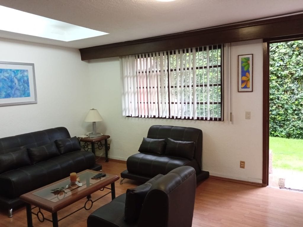"Mexican traditions", located in a Porfirian building in Roma Norte, decorated with references to Mexican traditions. It has: spacious and equipped bathroom; washing machine strategically located; kitchen equipped with grill, microwave, and refrigerator; dining room with table and chairs for four people; living room with sofa and chairs to relax. Master bedroom with king-size bed, closet, TV and air conditioning. Access to the garden from the living room and bedroom. Ideal for extended stays.