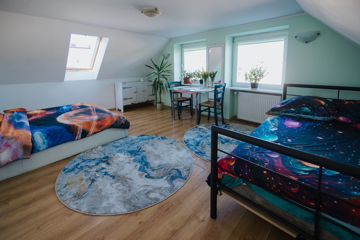 Cozy place in the center of Szczecin. Good for a couple, family, friends or people travelling for business. In the nearby: grosery, cafes, restaurants, public transport, railway and bus station. Walking distance to the old town and waterfront. The apartament is bright and cozy with modern &vintage finishing. Consists of 2 rooms: living room + sleeping corner with access to a lovely balcony and bedroom with double bed and piano. Inbetween the rooms modern kitchen and new bathroom.