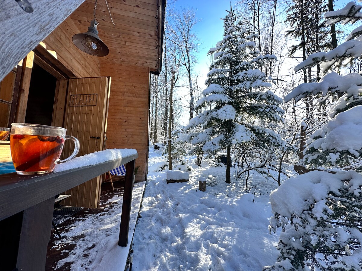 Domek w typie "cabin" na ogrodzonym, dużym i zadrzewionym ogrodzie. Prawie 1000 m2 zieleni sprawia, że jest tu pełna prywatność. Okolica jest spokojna. Trzy piękne duże jeziora w odległości 500-700 m Goście mogą liczyć na prawdziwą odskocznię od zgiełku, rozpalić w kominku, wsłuchać się w szum drzew, kumkanie żab i śpiew ptaków. Tutaj przyjedziesz złapać oddech w bezpiecznym miejscu na łonie przyrody, w sercu Pomorza Kaszubskiego.