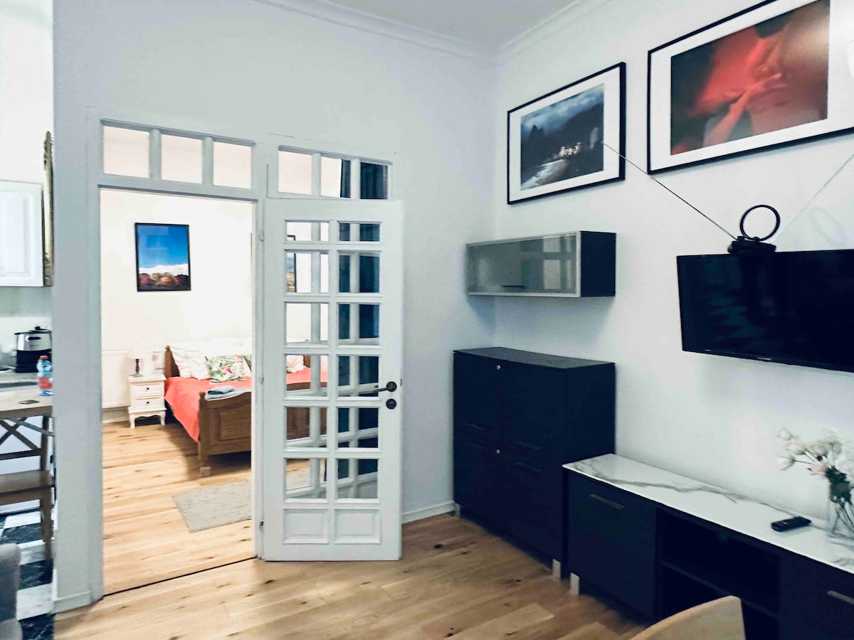 Experience tranquility in this elegant loft, located right next to the main train station and within walking distance to Market Square. Despite its central location, it is very quiet. The space features chevron wood floors, modern furnishings, and abundant natural light. Enjoy a minimalist kitchen and relax on a blue sofa. Set in a fully renovated historical building, it combines historical charm with contemporary elegance. A beautiful park with old trees is just across the street.