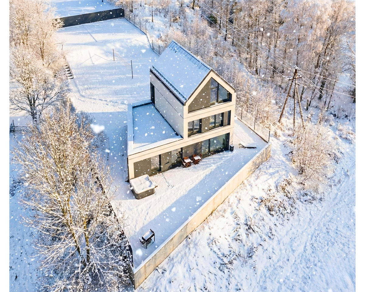 The East House Villa exclusively for you, with a private jacuzzi, fire pit, grill, beach volleyball court, 3 air-conditioned bedrooms, and panoramic views at the edge of the Beskid Wyspowy. Quality, minimalism, elegance.