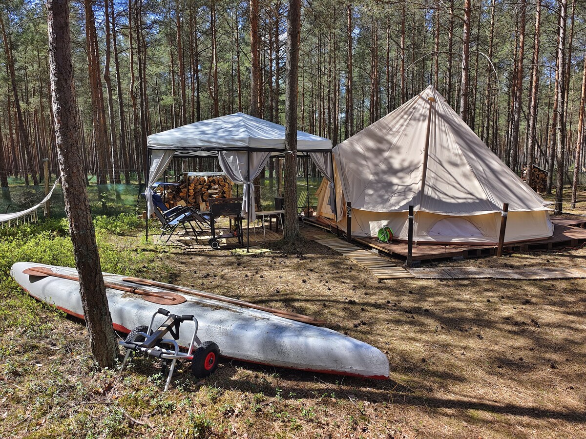 Sielsko i zielono, idealne na imprezę plenerową, wypad z przyjaciółmi, panieński czy kawalerski! Wynajmij cały obiekt dla max 20 osób w 5 namiotach. Blisko natury, z dala od miasta. W przestronnej zadaszonej wiacie możecie całą noc spędzić przy ognisku a potem relaksując się w balii z hydromasażem podziwiać widok na sosnowy las i dwa stawy. Plaża, SUPy, siatkówka plażowa, namioty w najwyższym standardzie z tarasami nad piaszczystą prywatną plażą.