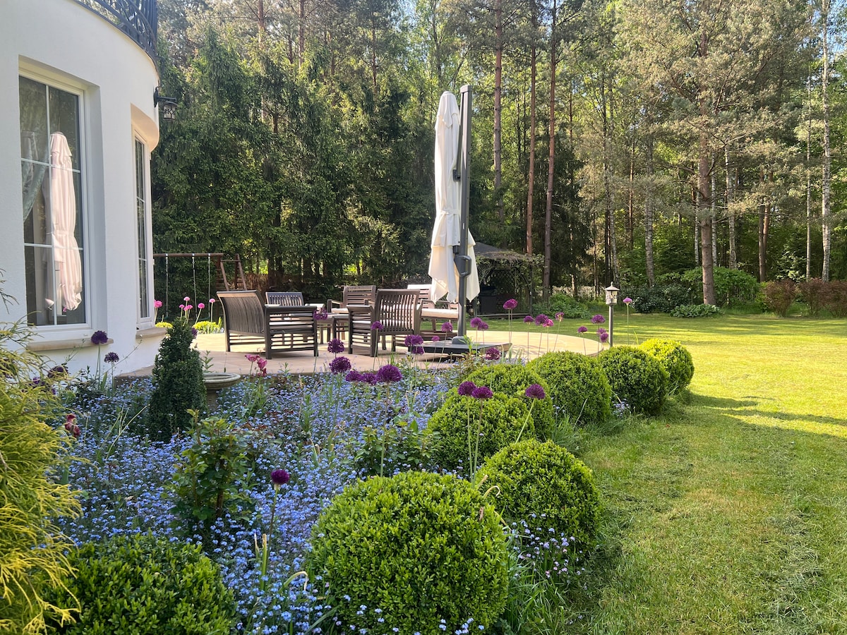 Spacious 5 bedroom 4 bathroom villa in the tranquil forest of Magdalenka, just outside Warsaw but 25 mins to centre. A stylish, comfortable house with a great garden, one of the few houses in the area with an outdoor swimming pool. Large furnished terrace, BBQ, sun loungers and a large balcony for morning cappuccinos on your stress-free break. On the mezzanine floor, you will find the elegant library with dedicated workspace overlooking the gardens and forest. Large floor to ceiling windows.