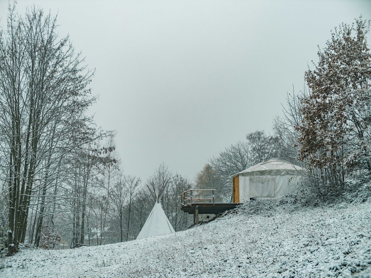 Romantic place for couples, close to nature. Silence, forest around, perfect base for hiking and trips in the area. The yurt is a year-round facility erected on a foundation, with wood wool insulation and infrared electric heating. Set and fastened to the foundation plate. The skylight in the roof allows you to watch the stars in the sky and on warm days it allows you to ventilate the yurt well. The main room has an area of 49 m2 and the glampod with a kitchen and bathroom an additional 15 m2